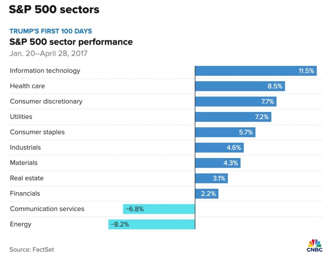 2017年,特朗普第一任期的前100天内,信息技术板块上涨了11.5%,而能源板块下跌了8.2%。但到目前为止,今年能源板块以9.2%的涨幅领涨市场,而科技股则下跌了0.2%,成为标普500指数表现第二差的板块。