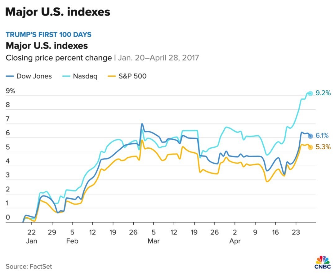 2017年,特朗普第一任期的前100天里,三大主要指数均是上涨的:标普500指数上涨了5.3%,蓝筹股道指上涨了6.1%,以科技股为主的纳指上涨了9.2%。但这一次,投资者表示市场可能不会再经历另一次大幅上涨。