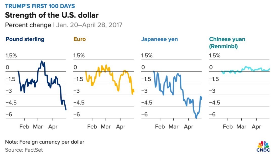 2017年1月至4月,美元对其他主要货币升值。自特朗普连任以来,美元因其更具保护主义和亲关税政策的推动而再次升值。但Boockvar和Hogan都认为,这一美元的上涨可能很快会失去动力。